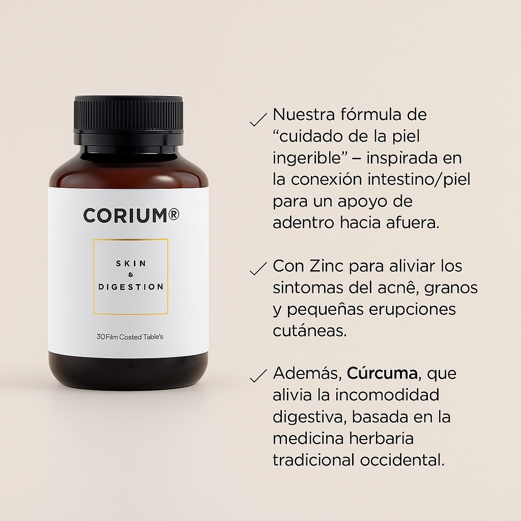 La fórmula Corium® – Piel + Digestión está diseñada para ayudarte a reducir granitos y acné, calmar molestias digestivas y apoyar la salud del sistema gastrointestinal. Combina ingredientes de alta calidad como Zinc, Burdock, Cúrcuma y Vitaminas esenciales, utilizados en la medicina herbaria tradicional occidental.