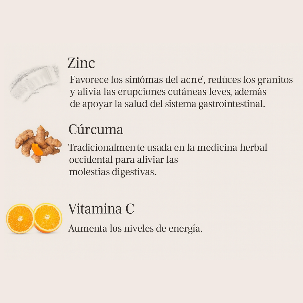 La mejor fórmula para olvidarte de los granitos, el acné y las molestias digestivas. Decile adiós a la incomodidad y a la irritación de la piel, y dale la bienvenida a un cutis más limpio, radiante y a una digestión más equilibrada, cuidando tu salud desde adentro de manera natural.